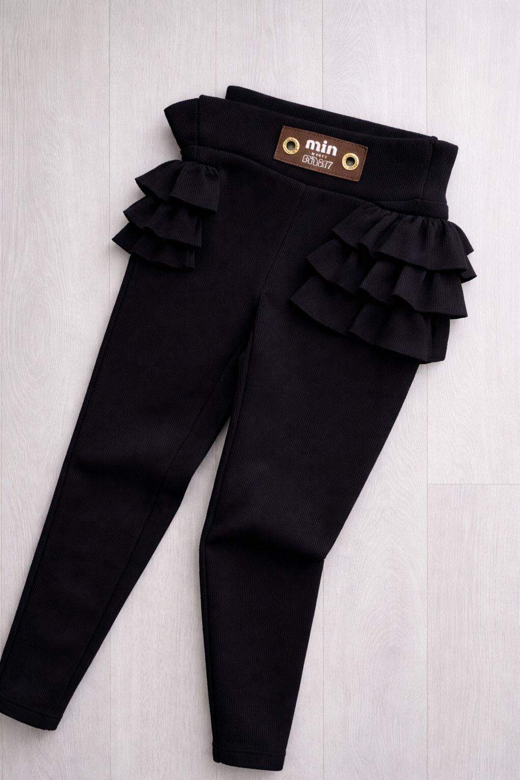 Modne, wygodne i mega stylowe!Czarne legginsy prążkowane z uroczymi falbankami – idealne do szkoły, przedszkola i na co dzień.